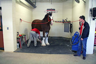 This is the grooming area. The horses are bathed once per week. Their feet are bathed every day to maintain the white color. Heaters are available in cold weather. Hooves are trimmed as needed. The horses are not shod until it is part of a team at an event. The shoes weight 5 pounds each and have special soles for traction on city streets where the horses perform.
