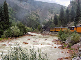 The train follows the Animas River from Durango to Silverton and covers the 45 miles in 3 1/2 hours before retuning to Durango. Sometimes the scenery is pastoral and sometime it is scary as the train rides on the very edge of a cliff with the river hundreds of feet below.